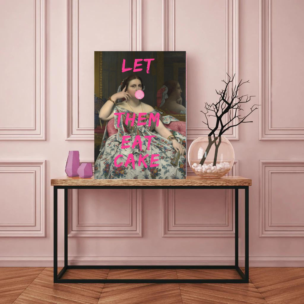 Add a touch of rebellious charm to your space with this striking “Let Them Eat Cake” art print from The Art Concept. A playful twist on classical portraiture, this artwork reimagines a vintage painting with bold pink typography and a modern pop-art edge. Featuring an elegant aristocratic woman casually blowing bubble gum, this piece combines historical grandeur with contemporary irreverence.